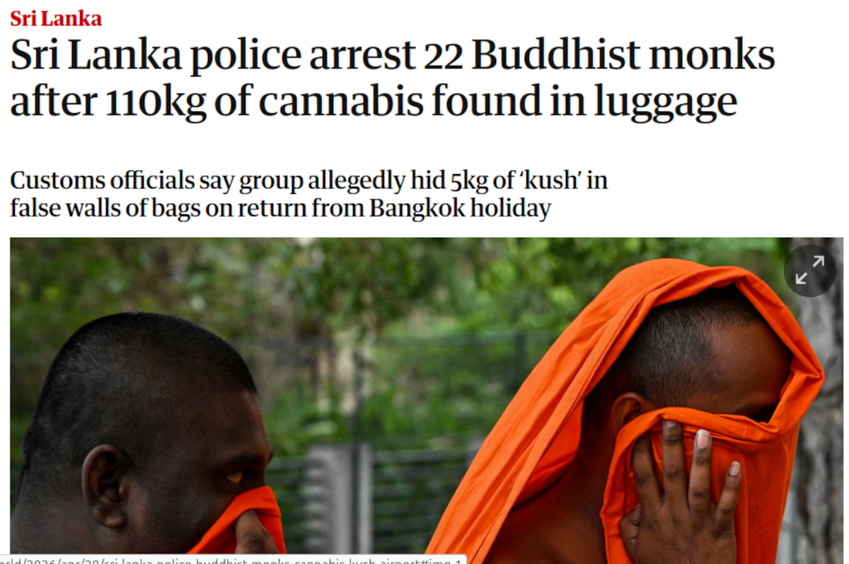 Sri Lanka police arrest 22 Buddhist monks after 110kg of cannabis found in luggage, Oliver Holmes,28/4/26