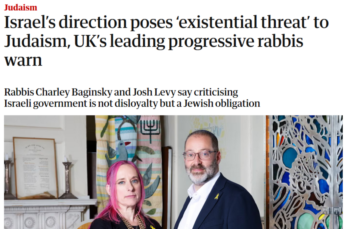 Israel’s direction poses ‘existential threat’ to Judaism, UK’s leading progressive rabbis warn, Aamna Mohdin, 28/4/26)