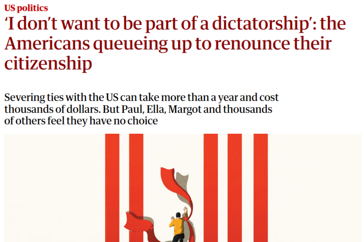 ‘I don’t want to be part of a dictatorship’: the Americans queueing up to renounce their citizenship, Zoe Williams, 28/4/26